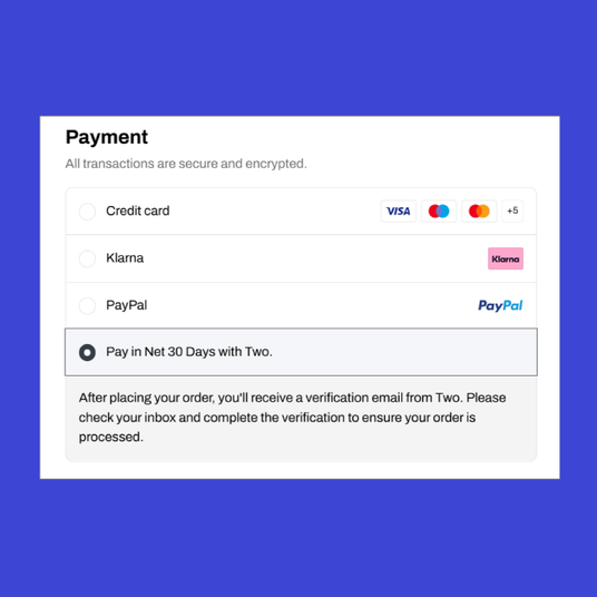 Two determines your credit limit using business information such as your latest filed accounts or, where relevant, data shared through Open Banking for UK buyers. It may also consider factors like how long your company has been trading to set a limit suited to your likely purchasing needs.